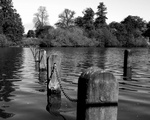 2009Houten paaltjes in The Serpentine in Kensington Gardens, Londen Oplage: 10 stuks Afdruk op dibond achter acryl glas - z/w foto in een zwart kader (zwarte kader is 4cm aan boven- en onderkant, 5cm links en rechts). De genoemde afmeting (40x50cm) is inclusief het zwarte kader. Achter de foto zit een aluminium u-profiel om het werk op te hangen.