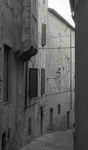 2010Lege straat in het dorp Barga in Toscane, Italië Foto 1 uit de serie "Italiaanse straten" Oplage: 5 stuks Afdruk op dibond achter acryl glas - z/w foto in een zwart kader (zwarte kader is 6cm aan boven- en onderkant, 6cm links en rechts). De genoemde afmeting (30x45cm) is inclusief het zwarte kader. Achter de foto zit een aluminium u-profiel om het werk op te hangen.
