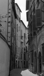 2010Lege straat in de stad Lucca in Toscane, Italië Foto 3 uit de serie "Italiaanse straten" Oplage: 5 stuks Afdruk op dibond achter acryl glas - z/w foto in een zwart kader (zwarte kader is 6cm aan boven- en onderkant, 6cm links en rechts). De genoemde afmeting (30x45cm) is inclusief het zwarte kader. Achter de foto zit een aluminium u-profiel om het werk op te hangen.